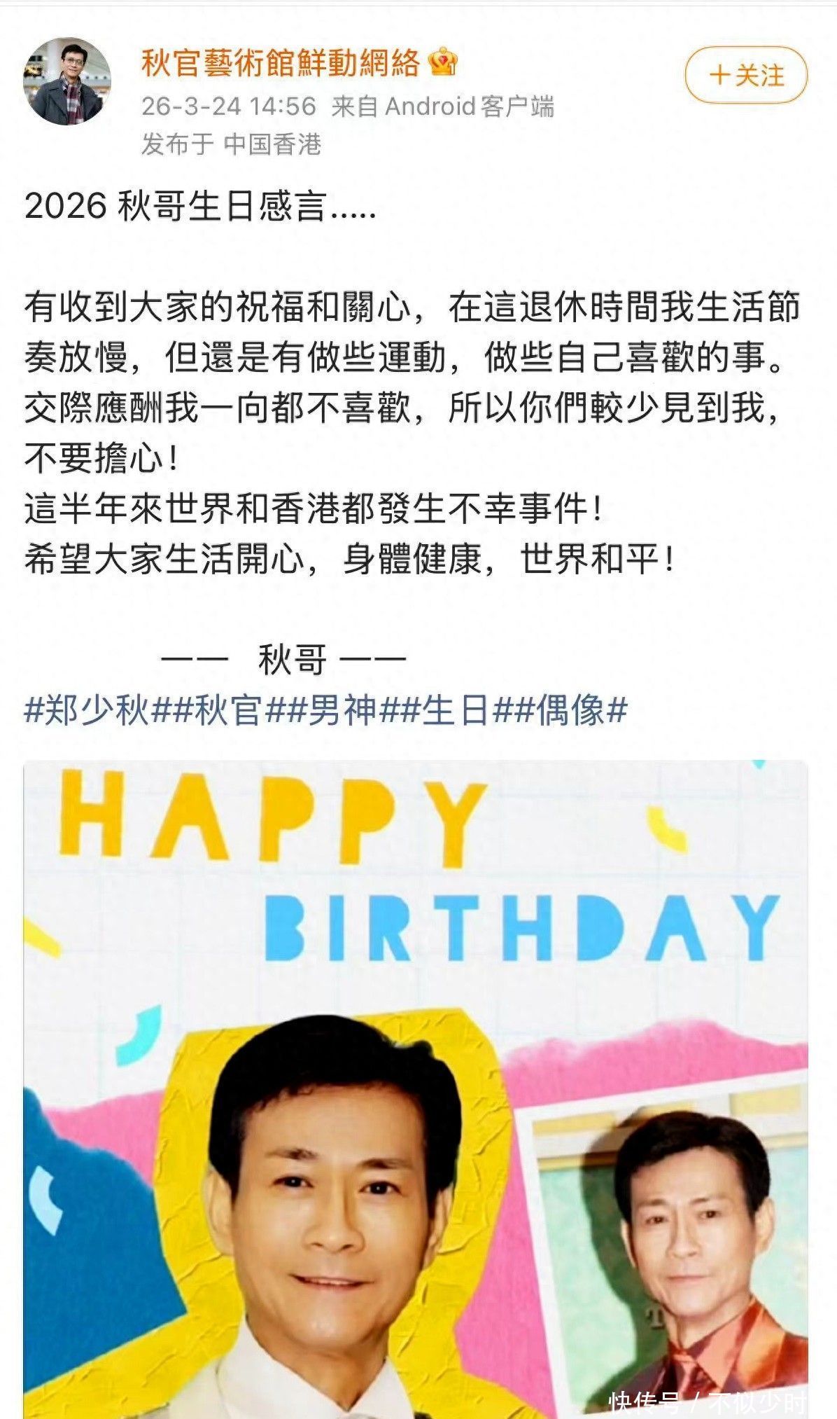 过去每逢寿辰,郑少秋惯以简短致谢回应祝福,言语谦和,点到即止。